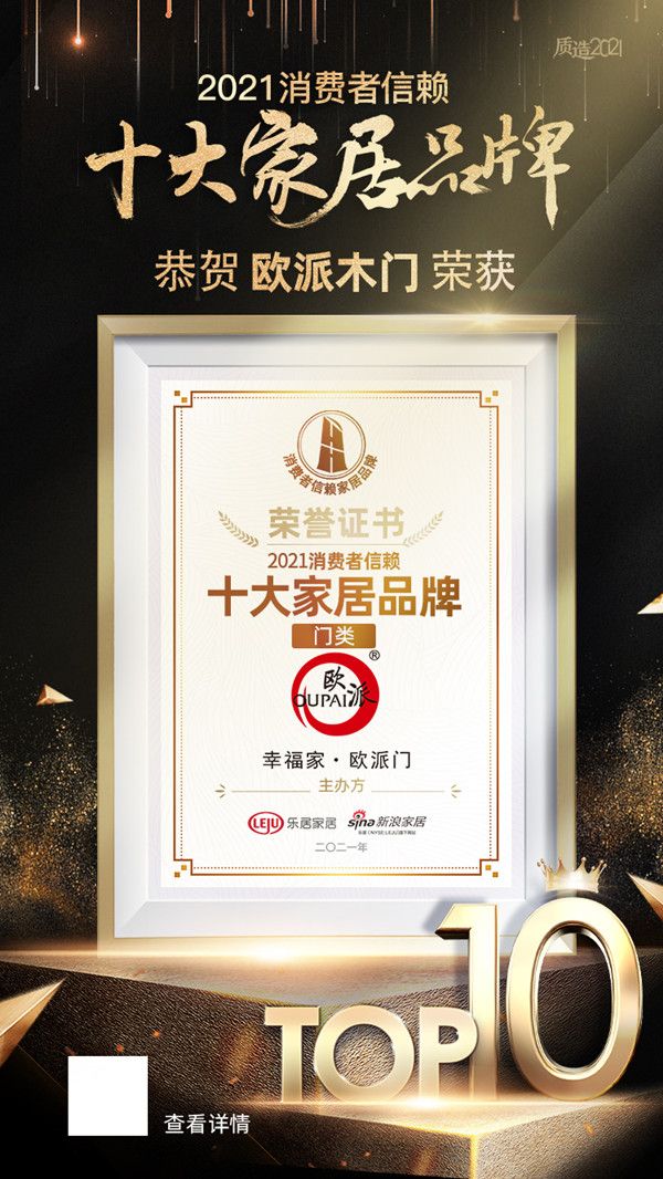 门窗快讯 | 重磅!欧派木门荣膺「2021消费者信赖十大门类品牌」