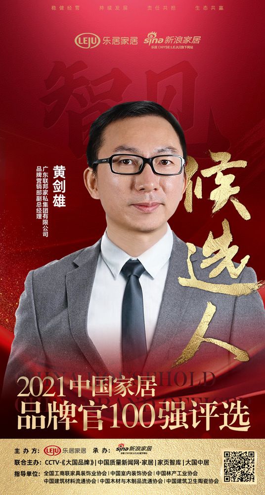 新浪家居讯 2021年10月18日,由乐居家居主办、新浪家居承办的「2021中国家居品牌官100强」正式启动。本次活动由 CCTV·大国品牌、中国质量新闻网·家居、家页智库、大国中居联合主办,全国工商联家具装饰业商会、中国室内装饰协会、中国建材流通协会中国林产工业协会,中国木材与木制品流通协会为本次活动指导单位。11月12日,联邦家私品牌营销副总经理黄剑雄获提名,成为「2021中国家居品牌官100强」候选人。
