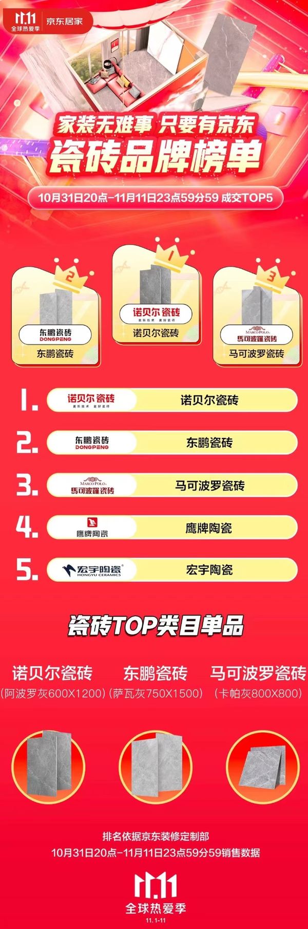 陶卫快讯 | 京东双十一瓷砖品牌成交榜出炉!马可波罗瓷砖进入成交TOP5榜