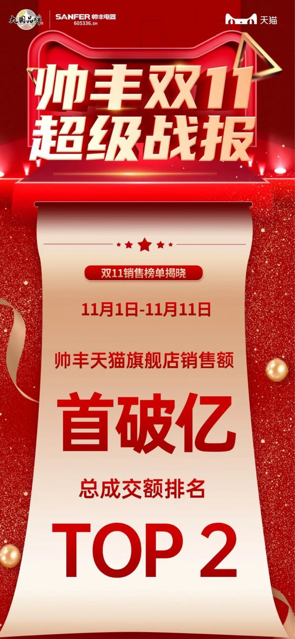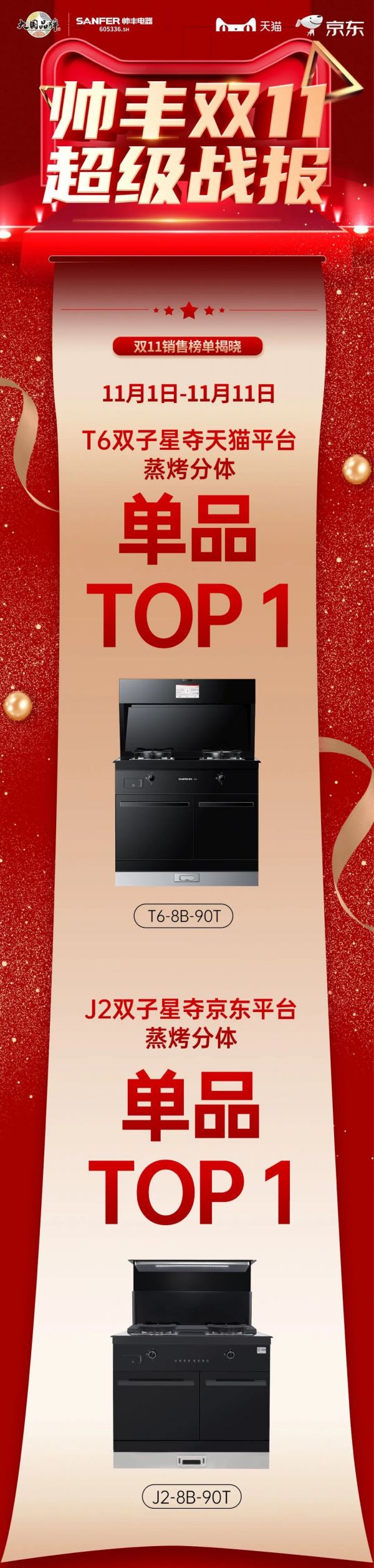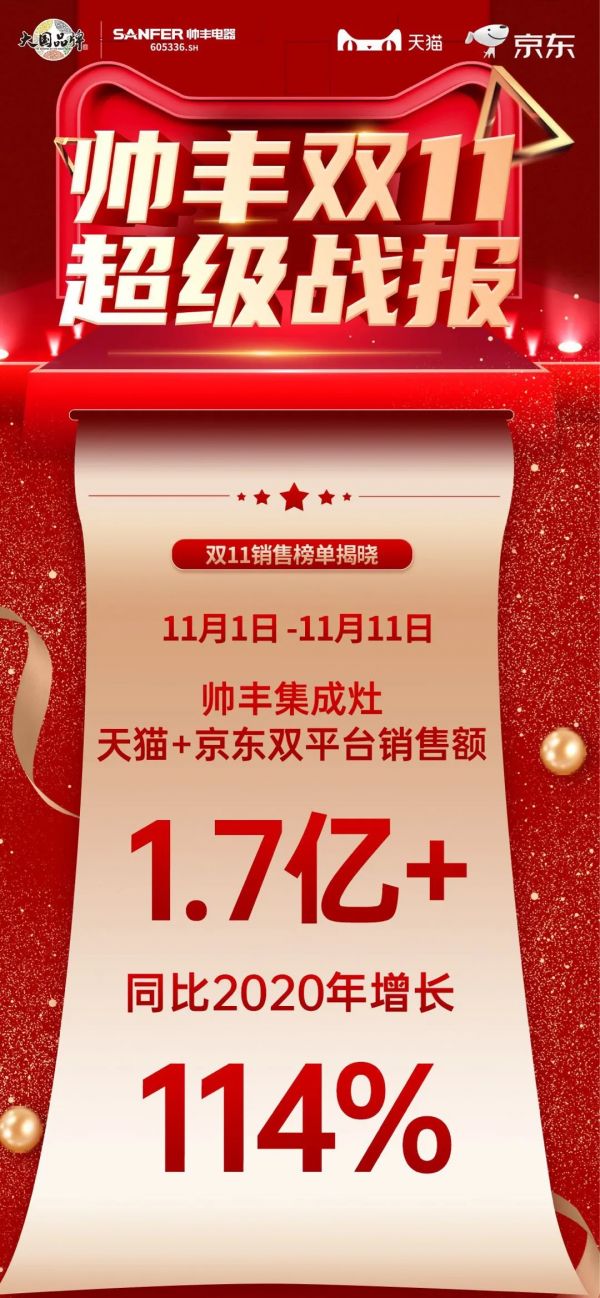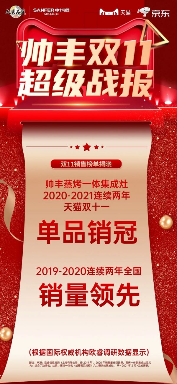11月12日,2021年双十一狂欢大促落下帷幕。帅丰电器以霸榜之势在众多集成灶品牌中成功突围,以绝对优势,强势登顶双平台销冠宝座。在11.1-11.11期间,蒸烤一体Pro集成灶J2双子星与T6双子星一举拿下天猫、京东双平台蒸烤分体单品第一。T1蒸烤一体集成灶强势霸榜天猫蒸烤一体单品第一。