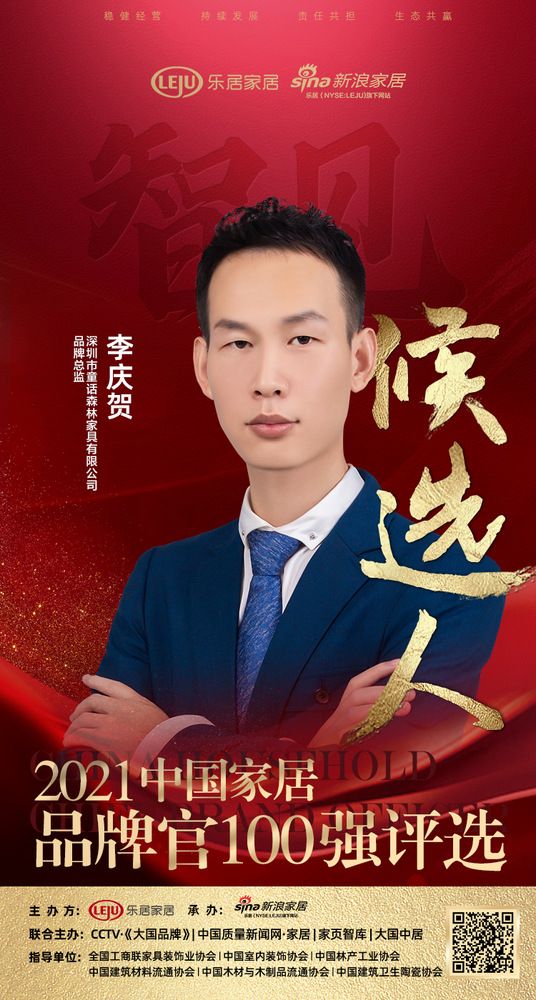 新浪家居讯 2021年10月18日,由乐居家居主办、新浪家居承办的「2021中国家居品牌官100强」正式启动。本次活动由 CCTV·大国品牌、中国质量新闻网·家居、家页智库、大国中居联合主办,全国工商联家具装饰业商会、中国室内装饰协会、中国建材流通协会中国林产工业协会,中国木材与木制品流通协会为本次活动指导单位。11月12日,童话森林品牌总监李庆贺获提名,成为「2021中国家居品牌官100强」候选人。
