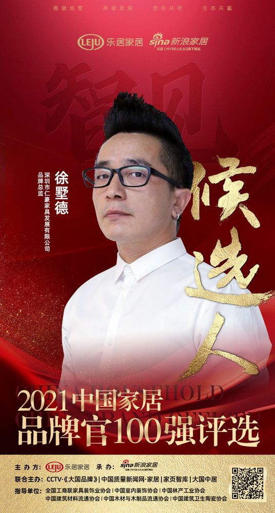新浪家居讯 2021年10月18日,由乐居家居主办、新浪家居承办的「2021中国家居品牌官100强」正式启动。本次活动由 CCTV·大国品牌、中国质量新闻网·家居、家页智库、大国中居联合主办,全国工商联家具装饰业商会、中国室内装饰协会、中国建材流通协会中国林产工业协会,中国木材与木制品流通协会为本次活动指导单位。11月12日,仁豪家居品牌总监徐墅德获提名,成为「2021中国家居品牌官100强」候选人。