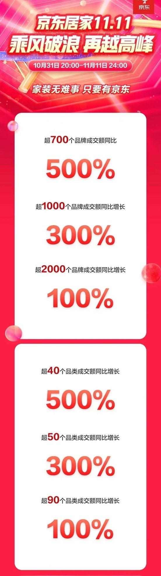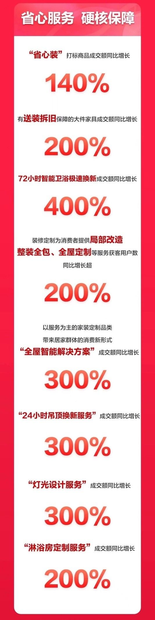以服务为主的家装定制品类,也在11.11期间大受欢迎。全屋智能解决方案成交额同比增长超300%;“24小时吊顶换新服务”成交额同比增长300%,其中奥普成交额同比增长300%,友邦成交额同比增长10倍。“灯光设计服务”成交额同比增长超300%,其中西顿照明11.11前5小时成交额超去年11日两倍。淋浴房定制成交额同比增长200%。“48小时开关免费拆旧换新服务”成交额同比增长30倍,广东佛山一名消费者通过配型工具下单,约40分钟完成收货,1小时内通过“京东服务+”完成一居室开关拆旧换新。京东官方刷新服务成交额同比增长5倍。