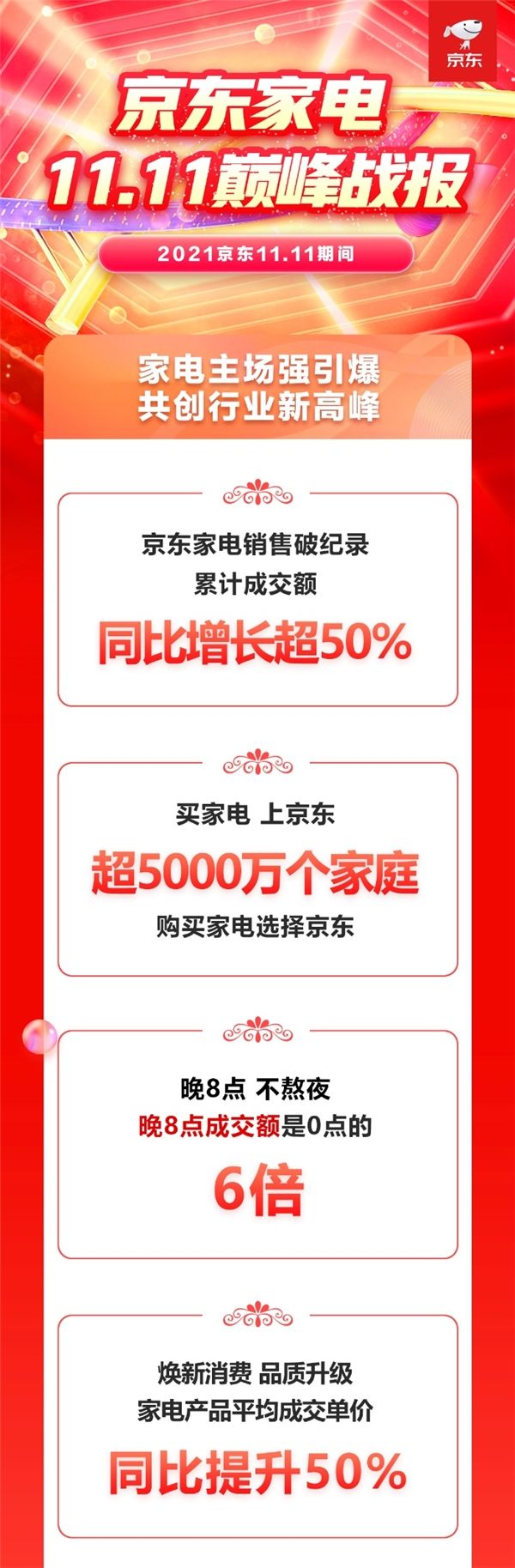 主场引爆再破新纪录 京东家电11.11累计成交额同比增长超50%
