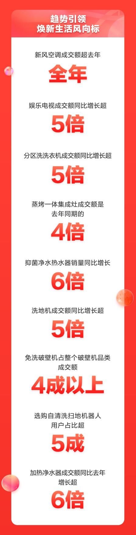 比如能给你异次元沉浸式畅玩体验的娱乐电视,具备视频通话、追剧、购物功能的大屏冰箱,它们在AI技术、智能交互、语音控制的加持下,都进化成了家电社交新阵地。京东家电11.11期间统计数据显示,娱乐电视成交额同比增长超5倍。在全民健康养生潮下,新风空调、集成灶、加热净水器作为各自领域的新兴品类,用户关注度直线上升。能时刻增氧换气、实现“呼吸自由”的新风空调成交额超去年全年;集蒸箱、烤箱、油烟机、灶具于一体的蒸烤一体集成灶成交额是去年同期的4倍;多档水温、满足全方位用水的加热净水器成交额同比去年增长超6倍。高质量宅家更欢乐,能省时省力有效终结“家务焦虑”的分区洗洗衣机、洗地机、免洗破壁机正在加速成为主流。分区洗洗衣机成交额同比增长超5倍,能解决衣物混洗细菌交叉问题,受到有孩家庭喜爱;洗地机成交额同比增长超5倍,扫拖二合一、一次性解决地面清洁难题,颇受铲屎官们的钟爱;免洗破壁机占整个破壁机品类成交额4成以上,具备自清洁、杀菌功能,深得精致人群欢心。还有抑菌净水热水器销量同比增长6倍,选购自清洗扫地机器人的用户占比超5成,这些新潮尖货和新兴爆品作为人们日常生活的好帮手,正在加速为全国各地消费者打造更美好的幸福生活。
