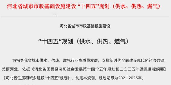 近期,河北省住房和城乡建设厅发布《河北省城市市政基础设施建设“十四五”规划(供水、供热、燃气)》。《规划》期限为2021-2025年,预计全省城市热源供热能力增加约1.5亿平方米,新建供热管网(含一次网、二次网)约2020公里,改造供热老旧管网约620公里。到“十四五”期末,集中供热和清洁能源供热面积预计增加10%。全省新增天然气供气量约30亿立方米,改造燃气老旧管网约120公里,新建城区天然气管网约2885公里。