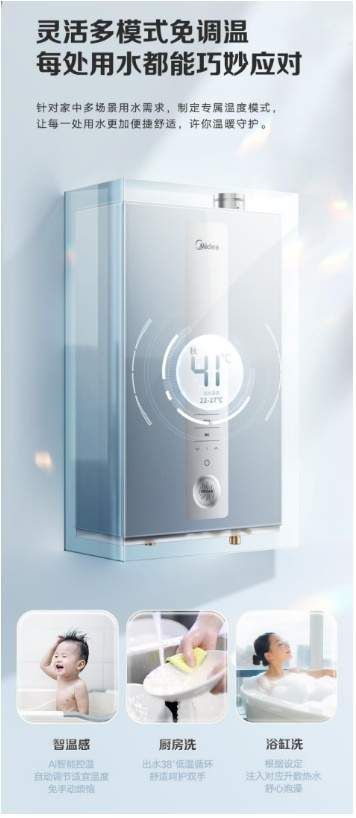 厨房洗碗洗菜,适配38°温水循环,洗碗更温和且易清洁;浴缸洗场景下,设定注热水升数,注满后自动提醒,美的零冷水燃气热水器LN5把沐浴这件放松事儿轻松搞定。
