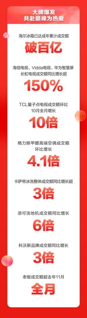 与此同时,各大品牌也在刷新着销售记录。海尔冰箱已达成年累计成交额破百亿;海信电视、Vidda电视、华为智慧屏、长虹电视成交额同比增长超150%;TCL量子点电视成交额环比10月全月增长10倍;格力除甲醛高端空调成交额环比增长4.1倍;卡萨帝冰洗整体成交额同比增长超3倍;添可洗地机成交额同比增长6倍;科沃斯品牌成交额同比增长3倍;老板成交额超去年11月全月。各大家电品牌代表均表示,在和京东家电的深度合作中,双方一直坚持以用户需求为核心,共建、共创市场,一路取得了良好的成绩,相信明年的11.11会再创奇迹。