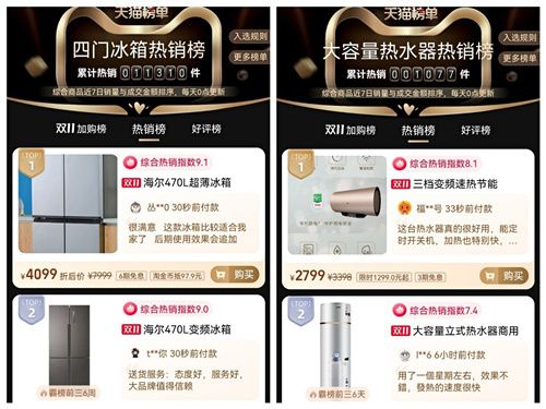 第二,高端产品持续引领市场。在今年双11期间,高端家电的用户认可度明显提升,海尔智家旗下高端产品持续引领行业趋势。其中,在今年流行的大空间4门冰箱热销榜中,海尔470L超薄冰箱以9.1的热销指数位居榜首;在大容量热水器热销榜中,海尔三档变频速热节能热水器排名第一。