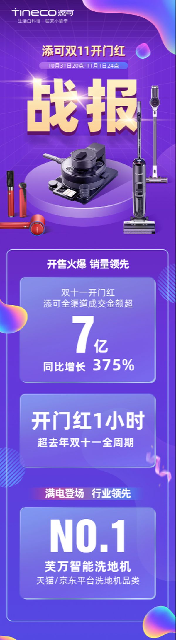 高端智能生活电器,洗地机品牌的“白科技”倡导者添可,双十一战报数据显示,全渠道成交额超7亿,同比增长375%,双十一开始 1小时销售额超去年双11全周期,添可芙万智能洗地机更是霸榜天猫、京东平台洗地机品类第一。