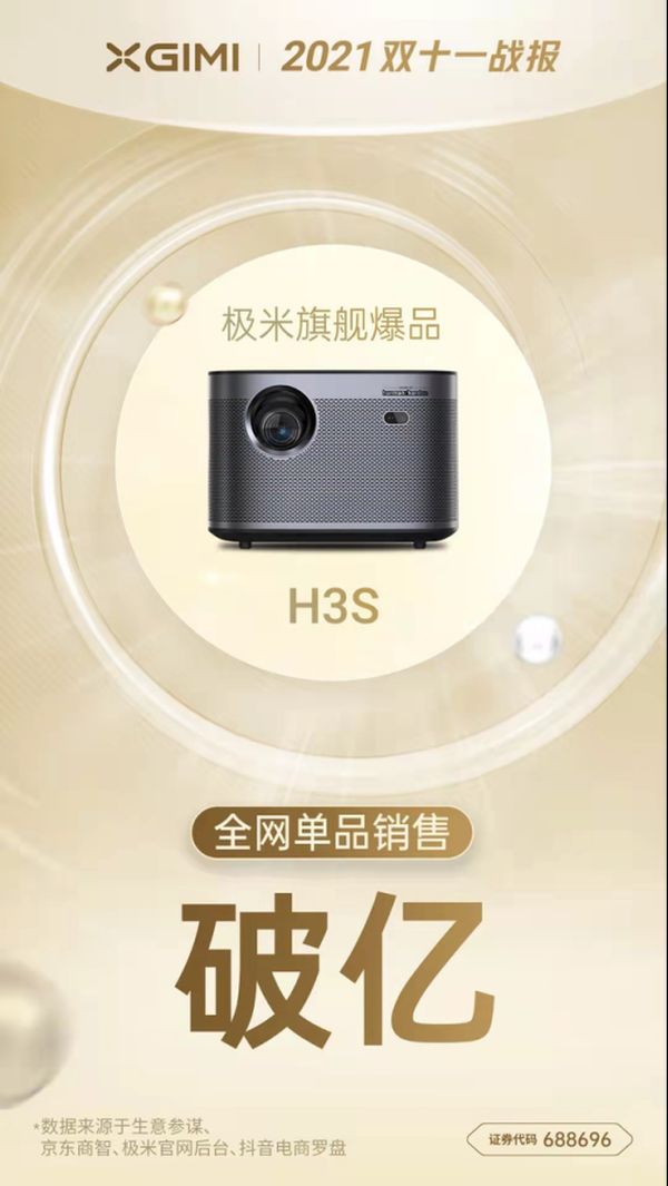 另一个双11销售冠军来自投影机行业的“一哥”极米科技。凭借强大的产品实力再创历史,仅用了1小时15分全网GMV就突破了2亿。相较于去年双11,极米在天猫平台用时51分销售额就超过了去年开门红全周期总额。其中,大受欢迎的极米NEW Z6X更是突破了20000台。另一款爆品极米H3S全网单品销售责破了亿元大关。