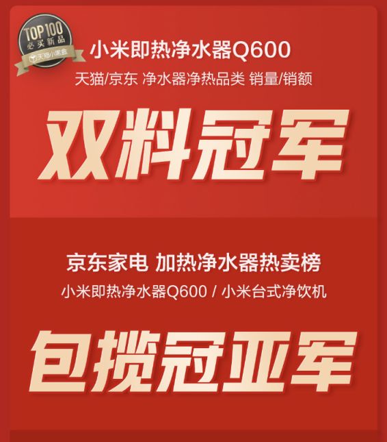 11·11的前半小时,小米台式净饮机,全渠道销量突破10000台,小米即热净水器Q600获得天猫/京东净水器净热品类销量/销额双料冠军。