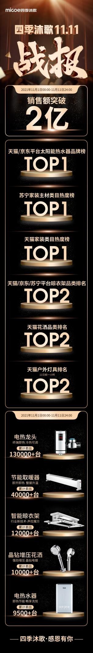 作为中国品牌价值500强企业和全球新能源500强企业,中国航天事业战略合作伙伴四季沐歌同样交上了一份亮眼成绩单:2021年11月1日00:00—11月11日24:00,四季沐歌销售额突破2亿,天猫/京东平台太阳能热水器品牌榜TOP1,苏宁家装主材类目热度榜TOP1,天猫家装类目热度榜TOP1,天猫/京东/苏宁平台晾衣架品类排名TOP2,天猫花洒品类排名TOP2,天猫户外灯具排名TOP2;电热龙头累计卖出130000+台,节能取暖器累计卖出40000+台,智能晾衣架累计卖出12000+台,晶钻增压花洒累计卖出10000+台,电热水器累计卖出9500+台。