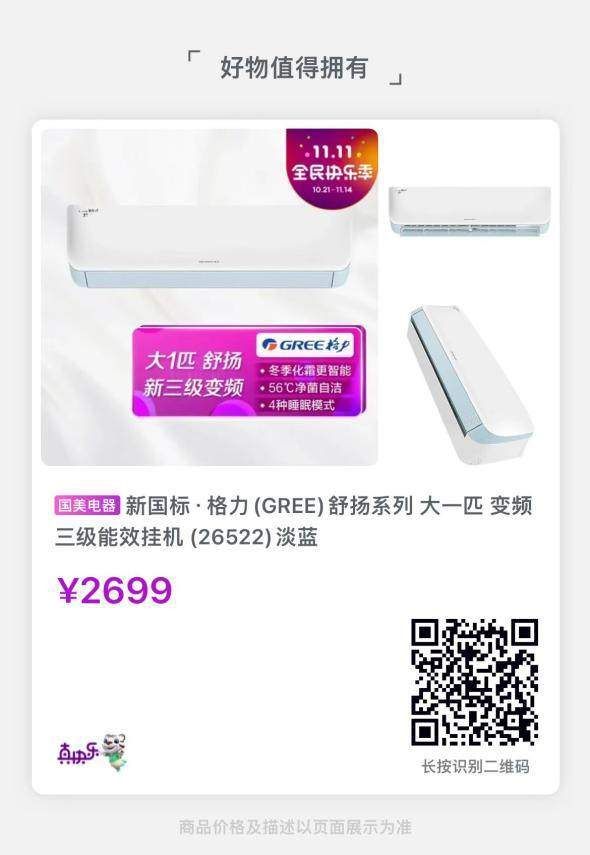 现如今,空调已经是家家户户必备的家用电器,想要低价换新空调,来国美电器双11返场大促就够了。国美电器为大家真选了一款格力舒扬系列空调,它搭载了高品质压缩机,性能稳定,带来强劲动力。并且,这款空调拥有循环大风量,制冷、制热效果更快,及时给你贴心温度,更有7档风速可调节,总有一种适合你。