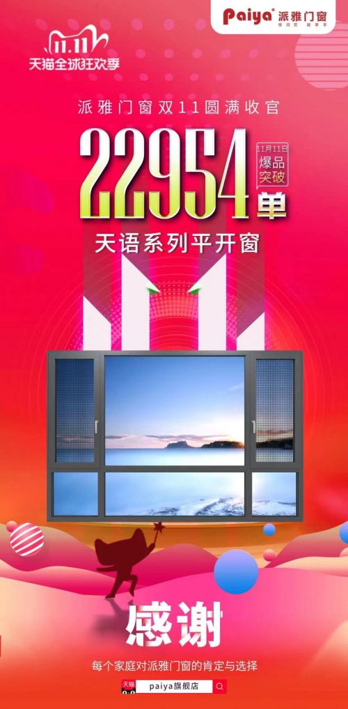 天猫双十一,派雅门窗勇夺门窗行业销量冠军
