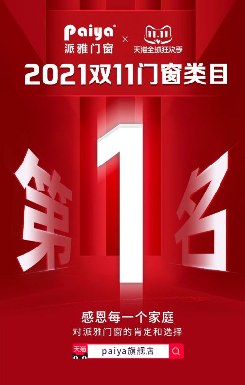 2021年双十一战报出炉!据天猫“生意参谋”数据统计,派雅门窗凭借广大家庭的喜爱,活动累计支付金额同比增长272%,勇夺2021双11门窗行业销售额第一等多项冠军。