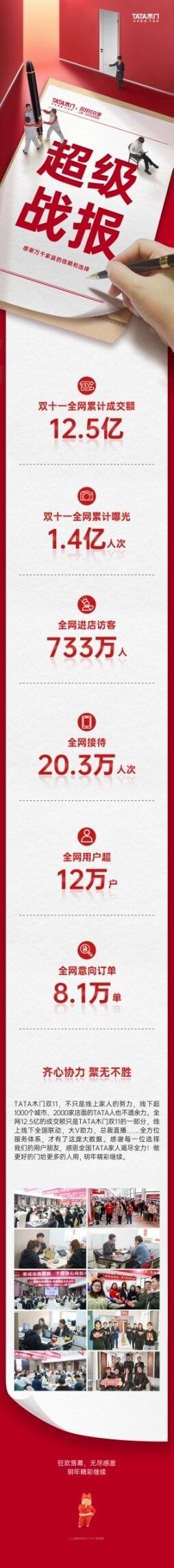 11月12日零点,TATA木门在双11活动期间全网累计成交额定格12.5亿,再次刷新历史。