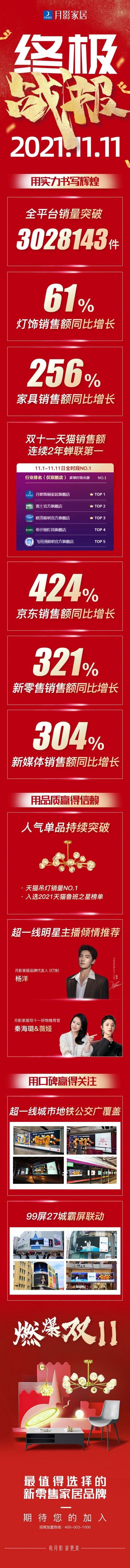 通过自媒体内容传播、新社交媒体产品种草拉力、横跨大半个中国的99大屏燃情助威、“慕光之城”快闪店网红打卡回溯照明时代变迁、超一线顶流明星直播间联袂助阵等一系列数字化营销活动,作为在家居家装行业灯饰类目中,唯一成功入选2021年度天猫双十一联合传播的头部品牌,月影家居为本季双11定制演绎了一场史无前例的海陆空全维度的品牌营销大秀。这些都彰显出月影家居与消费者高频互动、共情链接的“用户思维”,以及月影家居品牌“数字化”的基因优势。