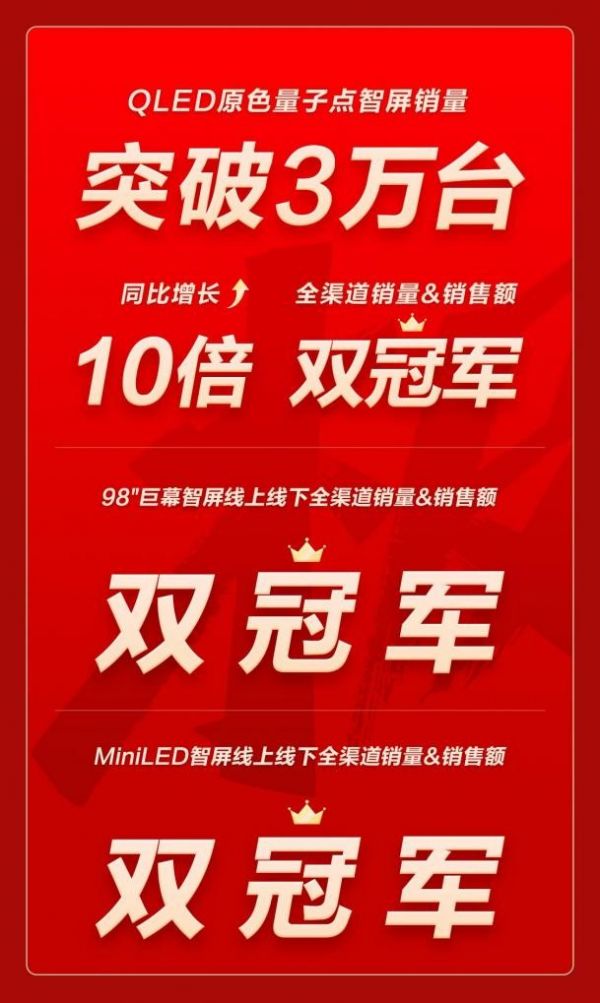 TCL智屏在多个品类渠道中,同时取得了多项第一。其中,QLED原色量子点智屏销量突破30000台,同比增长10倍!98英寸巨幕智屏实现线上线下全渠道销量&销售额双冠军!QD-Mini LED智屏毫无悬念的成为线上线下全渠道销量&销售额双冠军!傲人成绩完美彰显大国品牌的”智慧科技“实力。