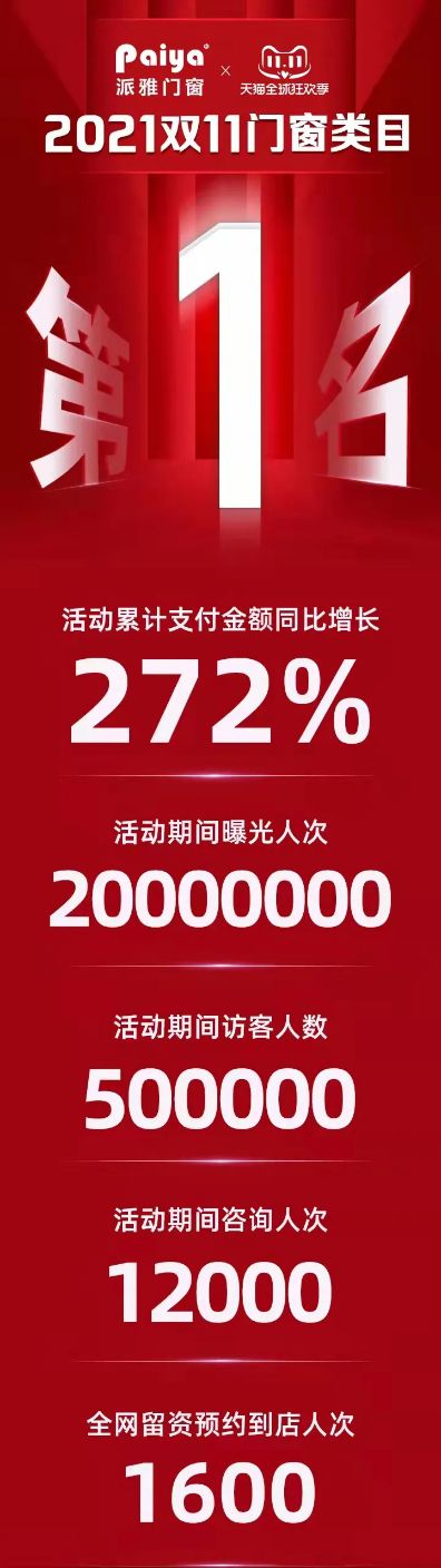 天猫双11战报出炉,据天猫“生意参谋”数据统计,派雅门窗强势登顶天猫双11全屋定制门窗类目销售额第一等多项冠军。铝合金门窗类目访客第一,铝合金门窗类目曝光量第一,品牌曝光增长超2000万+,活动累计支付金额同比去年增长272%!