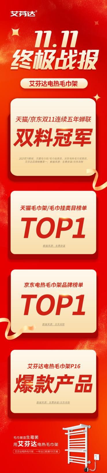 艾芬达双11战报:再度拿下双料冠军 稳居电热毛巾架品类榜首