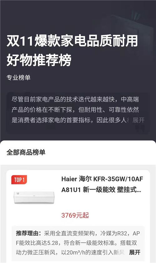 今年双11,海尔空调还成为“什么值得买”网站4大榜单置顶推荐NO.1。其中,海尔智慧卧室场景网器——静悦睡眠空调被“2021年重磅新品关注榜”、“心仪家电大件 双11好价关注榜”等2大榜单同时置顶推荐。海尔新风空调被评选为“双11爆款家电品质耐用好物推荐榜”NO.1。彩壳设计的海尔幻彩除菌舱空调入选“性价比精选家电好物榜”NO.1。