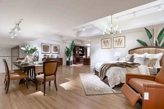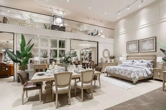 相比于其他区域的开阔感,较低层高区域的空间感更接近于实际户型给人的感受,让顾客在开放式的场景中直观地感受到家具所需要的占地空间,以及更直观的,在普通层高中的空间感受。