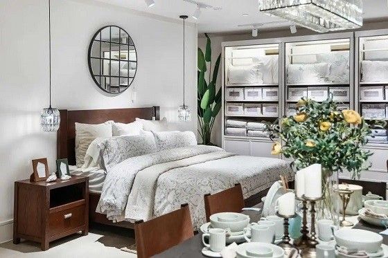 同时为了方便顾客自由组合,Harbor House门店在每个场景旁边设置了对应的货架,整齐摆放着可以与家具相搭配的各类饰品,如仿真花艺、家纺床品,桌面摆件等等,生活的想象力在这里恣意展开,生活的角角落落都被妥贴关照。