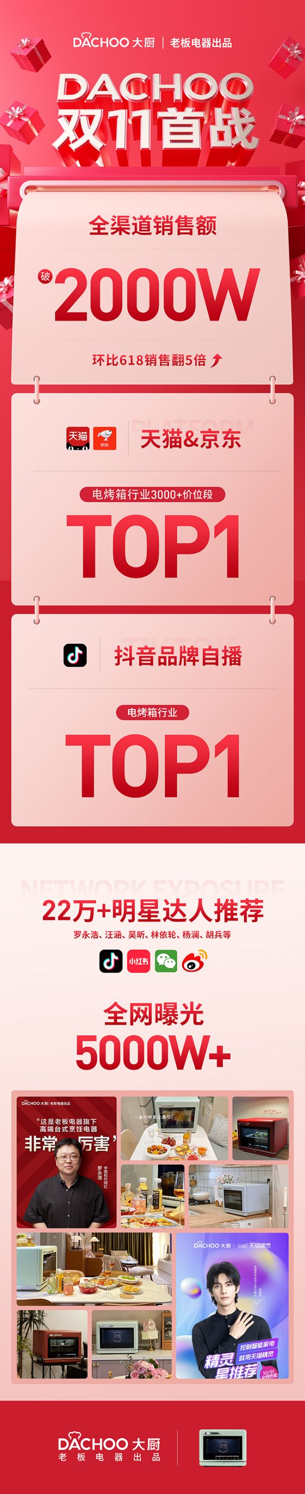 但在厨电领域还是有不少值得关注的现象。比如老板电器高端子品牌大厨,首战双11销售额就突破2千万,环比618销售翻5倍,并拿下天猫、京东电烤箱行业3000+价位段、抖音电烤箱类目行业多个 top1,获得罗永浩、汪涵、林依轮、杨澜等众多明星和22万+达人推荐等等。
