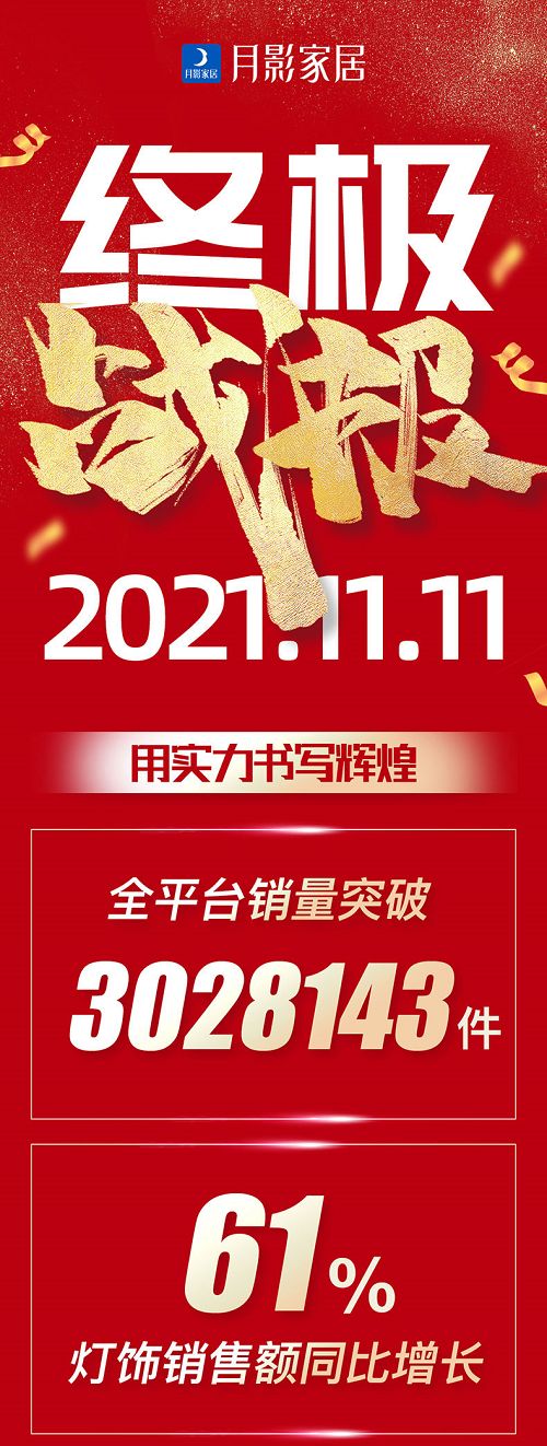 2021年11月12日零点,本季天猫双11完美收官,作为天猫美家TOP3的月影灯饰斩获了“连续2年蝉联第一”的王冠业绩。与此同时,全网销量突破300万件,灯饰销售额同比增长61%,家具销售额同比增长256%。京东销售额同比增长424%,新零售销售额同比增长321%,新媒体销售额同比增长304%。轻奢全铜分子吊灯登顶天猫吊灯热销榜No.1,并入选2021天猫鲁班之星榜单。