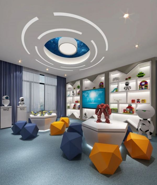 科学发现室延续幼儿教室的设计格调,同样以弧线堆叠韵律与艺术感,把充满创意与想象力的场景融入室内,充分挖掘孩童的天性,将日常细节中植根“乐趣”。各式各样的圆形、矩形,仿佛孩子画中的圆圆圈圈、方方框框,激发着孩子畅游太空的想象力。