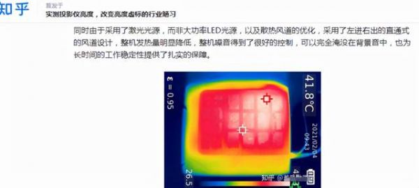 摘自原文:同时由于采用了激光光源,而非大功率LED光源,以及散热风道的优化,采用了左进右出的直通式的风道设计,整机发热量明显降低,整机噪音得到了很好的控制,可以完全淹没在背景音中,也为长时间的工作稳定性提供了扎实的保障。
