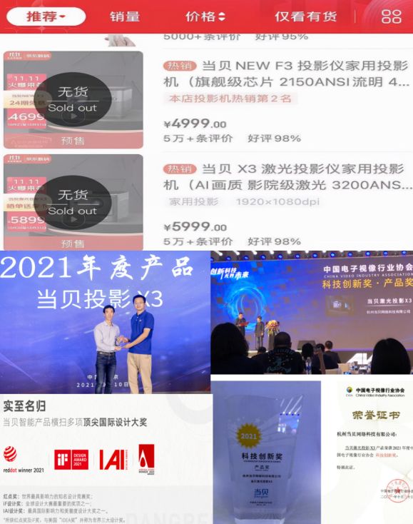 作为一款定位高端的年度重磅新品,当贝X3激光投影仪凭借3200ANSI流明的高亮度、旗舰级芯片高性能,迄今半年左右时间数次出现售罄、卖断货一机难抢的全网热卖情况,并获得了多种销售表现赞许和国内外荣誉,如618全网激光投影仪销售第一,双11开门红1分钟全网卖到无货。
