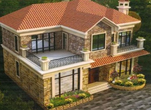这款房屋看起来非常的整洁舒适、外墙全部采用了文化石进行装饰、远看别墅的外墙就像是一朵盛开的蔷薇花、妖娆多姿。此外外墙凹凸不平的设计、则能为添加几分灵动性、不会显得过于的方正呆板。橙色的屋顶、则可以让房屋更加的和谐统一。