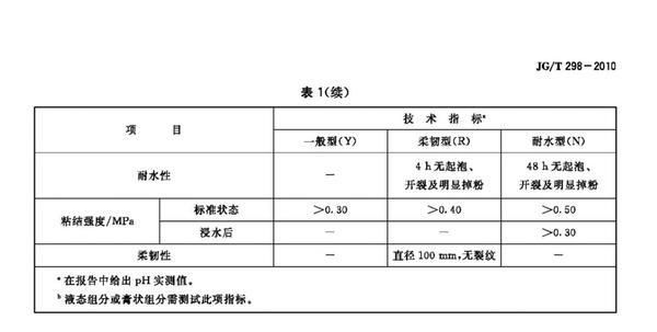 国家对于耐水腻子有严格的执行标准:JG/T298-2010《建筑室内用腻子》中的N型技术指标,粘结强度大于0.5MPa以上,(普通腻子或腻子膏标准要求为0.3MPa)同时要求具备耐水性能(水泡48小时不粉化、起泡、脱落),浸水后粘结强度仍然不得低于0.3MPa。