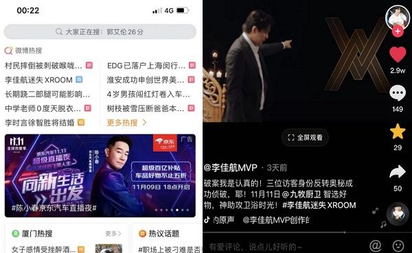 在一系列高频次营销动作后,更是通过李佳航抖音、工作室微博公布揭秘视频,将话题#李佳航迷失X·ROOM#讨论度和传播热度推向高潮,一举冲上热搜。明星同款,KOL倾情推荐,跨界品牌多维联合互动成功出圈,从剧本杀内容引流到九牧双十一,完成对年轻消费者的种草到转化的闭环。