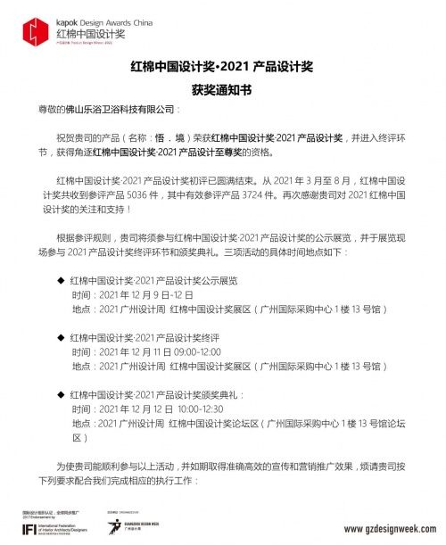这次浴旺的产品(悟·境)荣获红棉中国设计奖·2021产品设计奖,并进入获得角逐红棉中国设计奖·2021产品设计至尊奖的资格。