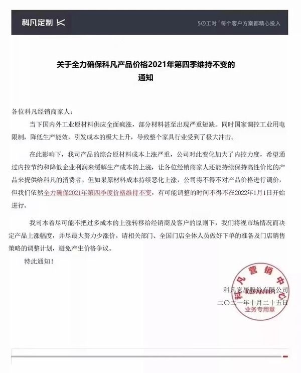 新浪家居定制频道讯 伴随板材行业一片涨价热潮,带动了定制家居的新一波涨价热潮。近日,科凡反其道而行,发布“暂不涨价通知”。