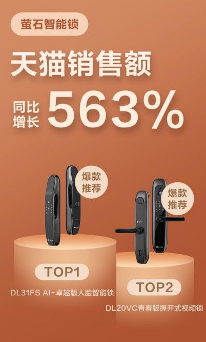 此外,今年萤石智能家居也有新的突破——萤石智能锁迎来爆发式增长,开门红当天天猫销售额同比增长 563%。
