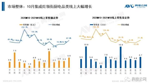 不仅1-9月,根据奥维云网(AVC)线上推总数据显示, 集成灶10月零售额依然保持增势,同比大幅上涨67.6%;零售量同比增长21.6%。线下表现,零售额、零售量同比分别提升38.1%和22.4%。集成灶重新回归全线增长风格。