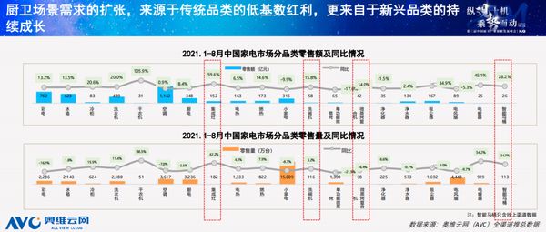 上图可以看到今年1-3月集成灶极速回暖态势尤为明显,虽然进入4月之后增速整体放缓,但是下图反映出前8月无论是零售量还是零售额都同比增幅在40%以上,是奥维云网(AVC)统计在内所有家电品类中增幅最大的。说其实新兴品类代表毫不为过。