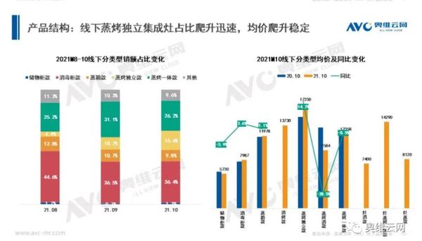 综上,仅从产品层面来看,今年集成灶行业的蒸箱款集成灶卡位消毒柜款,主销价格段差异较小,挤压销售;同时新品承接力度不足,蒸箱款集成灶新品多以高端为主,后浪渐弱;反而是蒸烤一体款产品高端化稳定提升,成增长最强拉手;且蒸烤独立集成灶受重视程度逐渐提升,类型具备高端牵引力。这些特征,在10月的市场端数据都得到了很好的体现。