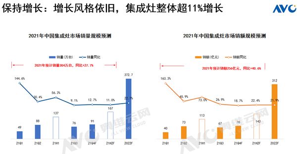 基本上,以上的集成灶行业特征,也已经能概括今年全年态势了。奥维云网预计,2021全年集成灶整体市场将保持增长风格,同比整体增长幅度在11%左右。其中,2021年预计销量304万台,同比增长27.7%。2021年预计销额256亿元,同比增长40.6%。
