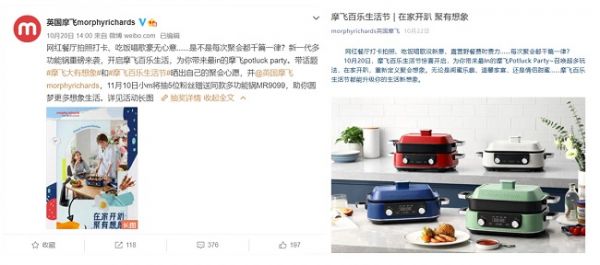 10月20日,摩飞官方微博、微信相继官宣“摩飞百乐生活节”开启,邀请用户晒出自己的聚会心愿,和摩飞一起接力想象生活,引发用户热烈讨论互动,正向声量迅速攀升。微博话题#摩飞大有想象#、#摩飞百乐生活节#总曝光高达1.5亿+,总互动量6.2w。