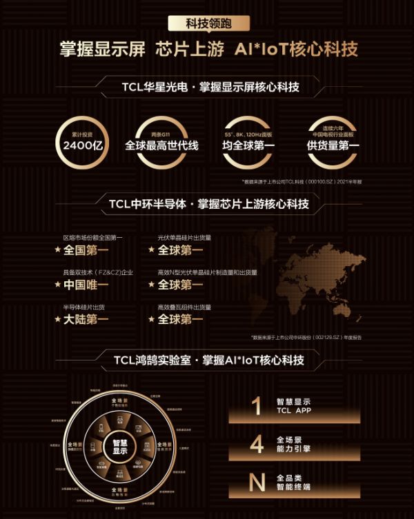 先从技术开始说起,首先就是依托TCL华星光电在显示屏核心科技上的推动,通过累计投资2400亿,打造出了两条G11全球最高世代线,且它所生产的55英寸、8K、120Hz面板均为全球杰出,而且如今已经连续6年中国电视行业面板供货量取得佳绩。另外一点则是在芯片上游核心科技上的推动,作为一家具备双技术(FZ&CZ)企业,TCL中环半导体拥有区熔市场份额,且其半导体硅片出货也取得佳绩,还有光伏单晶硅片出货量、高效N型光伏单晶硅片制造量和出货量、高效叠瓦组件出货量这三项均取得傲人成绩。最后则是AI×IoT核心科技上的推动,TCL鸿鹄实验室所打造出来的“1+4+N”智慧解决方案也赋予了智屏更强的市场竞争力。