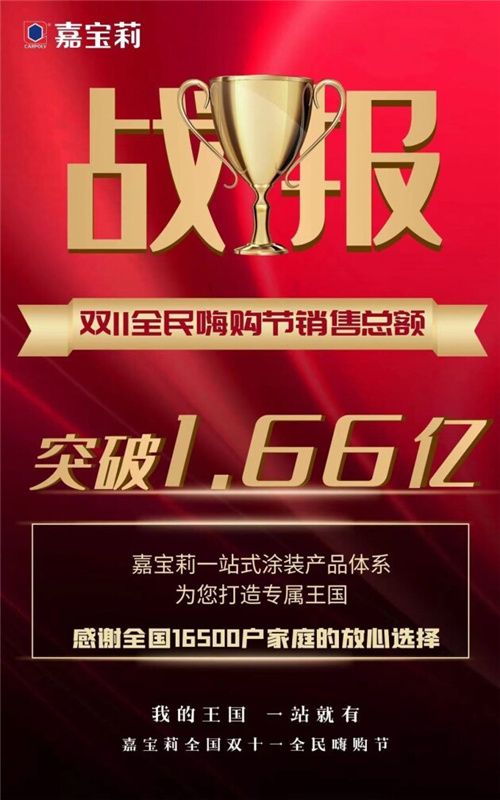 在时代进步与全球疫情双重影响下,新消费已成为我国经济的新动能。为积极响应国家“双循环”战略,加速高质量发展,作为全球涂料40强企业之一,嘉宝莉不但持续奋进提升产品质量水平和客户服务水平,更是用全新面貌打造线上线下融合的新商业模式。以今年的“双十一狂欢节”为例,嘉宝莉联合线下千家门店,共同打造“我的王国 一站就有”全国双十一全民嗨购节,嘉宝莉用心服务客户,创下了双十一1.66亿的好成绩。