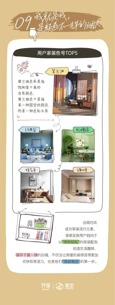 色彩是实现个性化装修最便捷的工具,大面积的墙面颜色是人进入室内的第一视觉,可为家居环境重新注入灵魂。其中,莫兰迪、经典蓝、牛油果绿、暖灰色、裸咖色等荣登家装配色的TOP5,配色大胆,路线温馨,这一届的准银发族审美半点也不亚于年轻人!