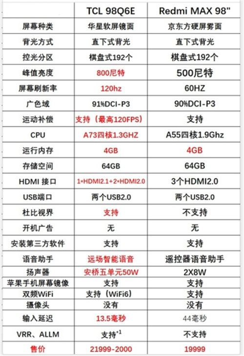 对于游戏主机玩家来说,如今游戏都进入了4K时代,最重要的是VRR可变刷新率以及HDMI2.1接口,而这两款电视中,TCL 98Q6E则是两者都支持,而Redmi MAX 98均不支持,估计Redmi是因为成本考量。在输入延迟方面,TCL 98Q6E更是以13.5毫秒完胜Redmi MAX 98的40毫秒,差距显而易见。