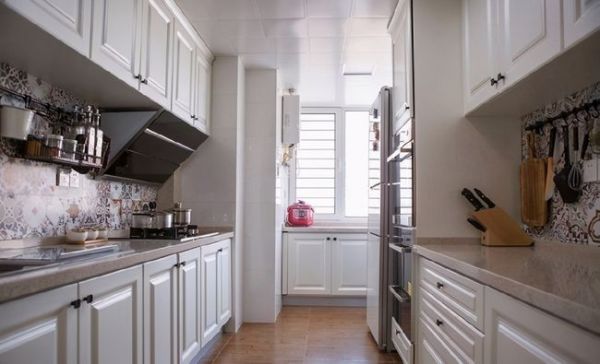 厨房,整个长方形的厨房空间还算是比较的宽敞,而且采光也比较好,主要是尽头的窗户采光超好,而且定制的橱柜也非常实用,把大部分的厨电都直接内嵌到柜子里面,增大了整个厨房的实用空间。