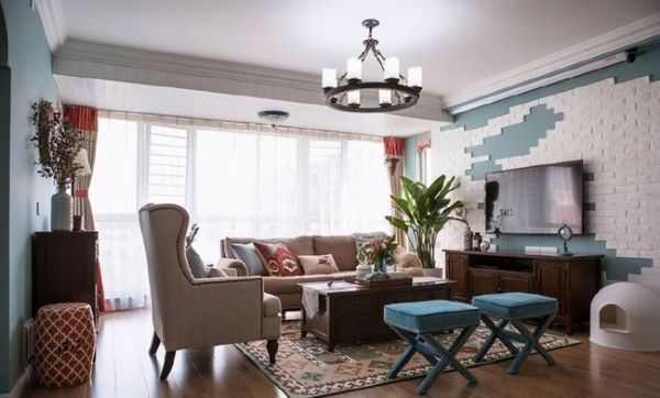 电视背景墙做了造型的设计,用的是文化砖作为背景设计,而底色则是灰蓝色的乳胶漆。整个美式风的家具装饰非常的大气美感。